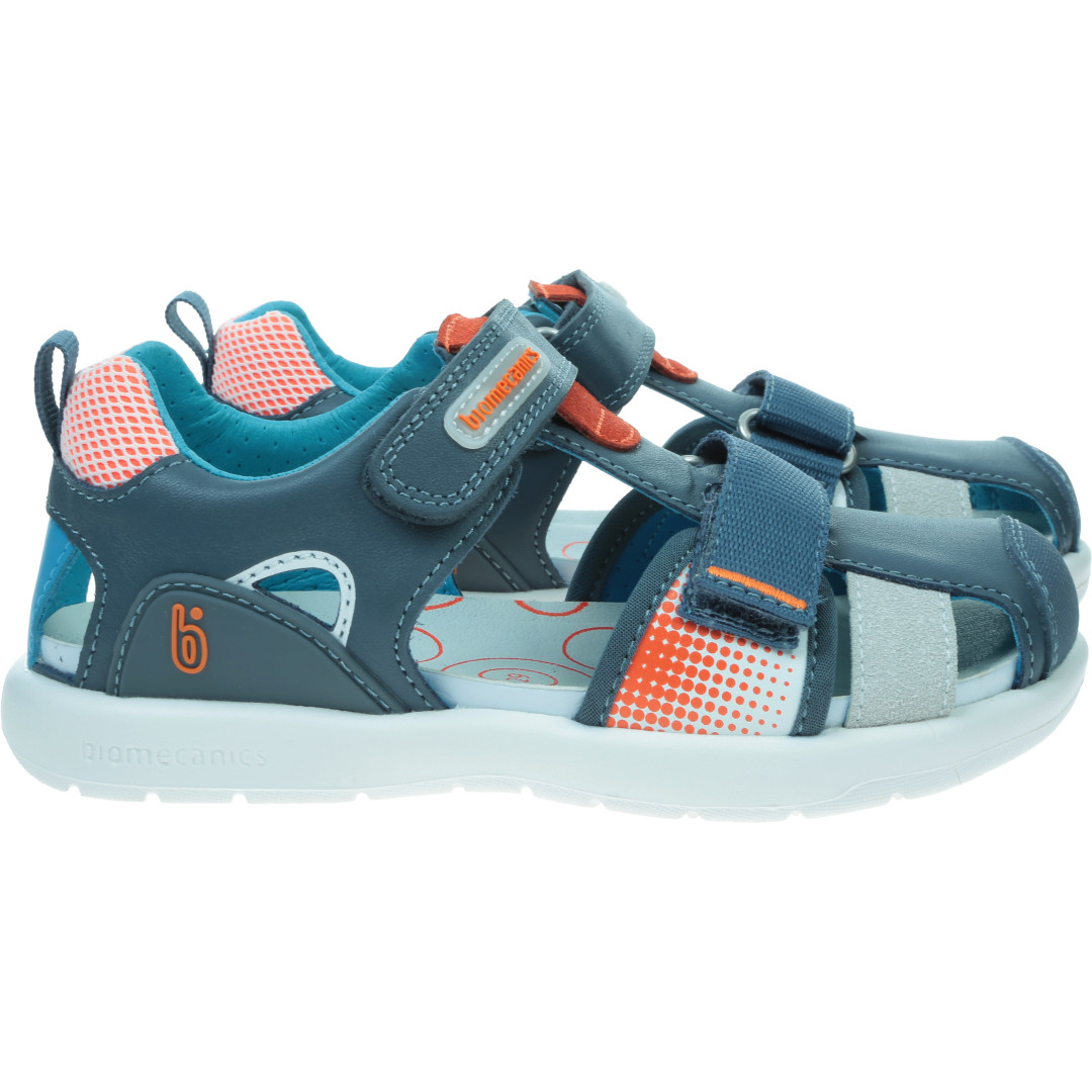 Zabudowane sandały dla dzieci Biomecanics wykonane są z najlepszej jakości skóry naturalnej. Posiadają oddychającą i antybakteryjną wkładkę. Lekka, antypoślizgowa i elastyczna podeszwa z opatentowanym stabilizatorem pięty. Sandałki Biomecanics posiadają zapięcie na rzep - który umożliwia dopasowanie do szerokości stopy dziecka oraz ułatwia szybkie zakładanie. Cholewkę można mocno rozchylić - but łatwo się zakłada i zdejmuje. Biomecanics buty wspierają naturalny chód dziecka i prawidłowy rozwój stopy. Boczne stabilizatory kontrolują odpowiedni ruch stopy.