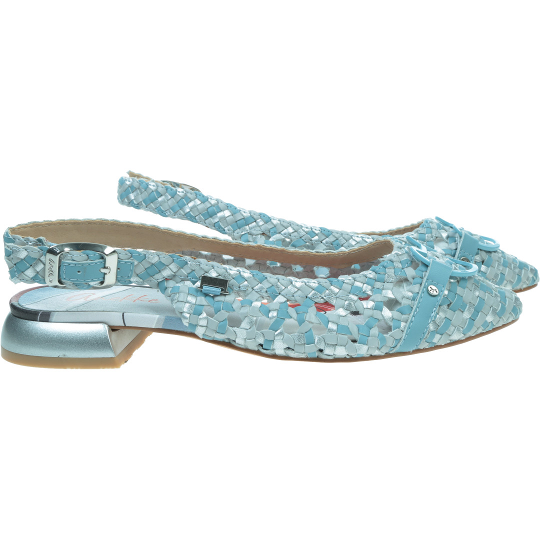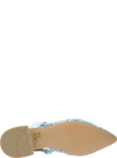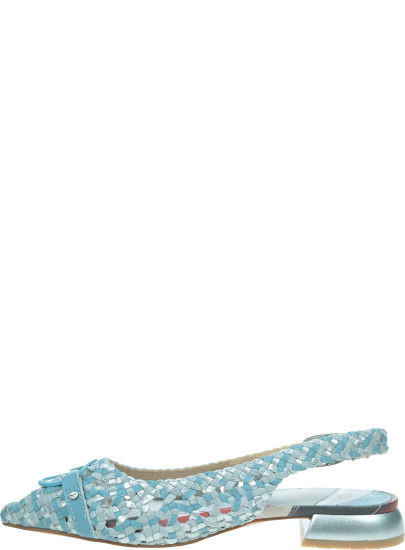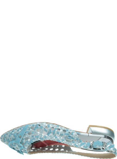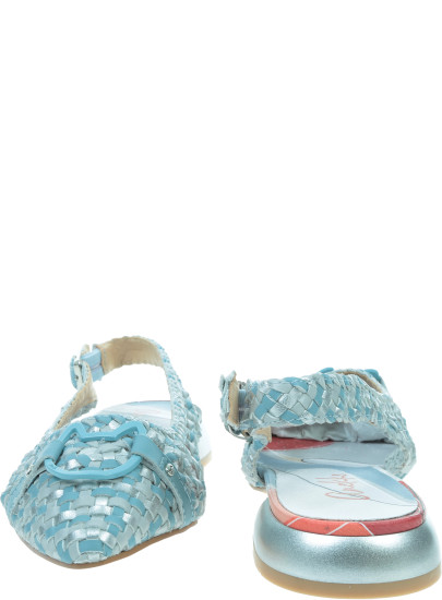 Pleciona cholewka w odcieniach błękitu i srebra subtelnie połyskuje i pięknie dopasowuje się do stopy. Naturalna skóra zwiększa przewiewność oraz komfort użytkowania. Regulowany pasek z metalową klamrą umożliwia idealne dopasowanie, a ozdobny detal z przodu podkreśla charakterystyczny, artystyczny styl marki.