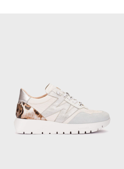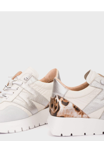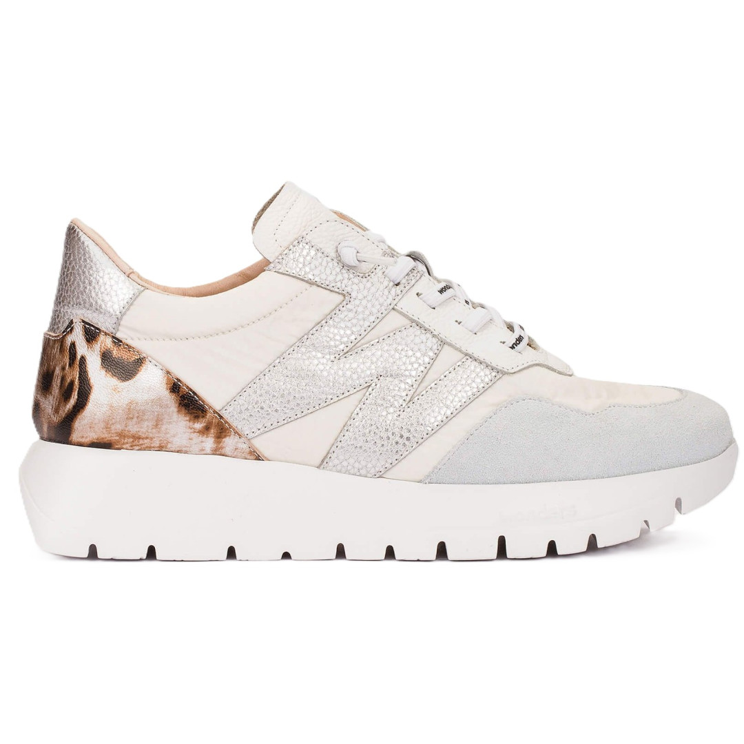 Nowoczesne sneakersy Wonders ODISEI 00 to połączenie stylu premium i wyjątkowego komfortu. Model wykonany z wysokiej jakości białych skór naturalnych wyróżnia się modnymi detalami – efektowną piętą z motywem animal print oraz metalizowanymi elementami „W”, które dodają całości charakteru.