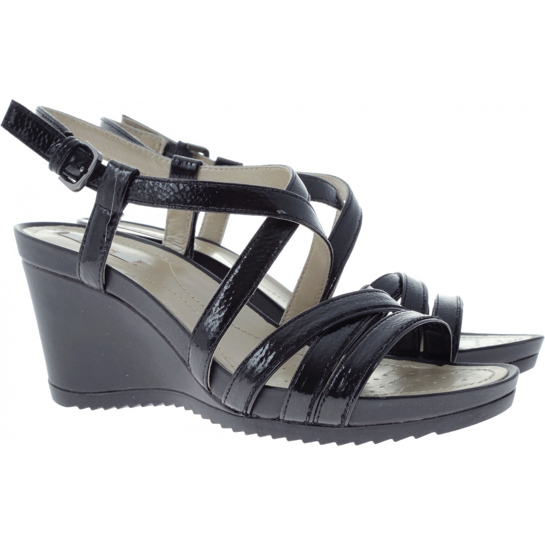 Czarne sandały na koturnie Geox Rorie wykonane ze skóry ekologicznej . Zgrabny fason z delikatnymi paseczkami wokół kostki świetnie prezentuje się na nodze i ozdobi każdą stylizację. Fakty dotyczące produktu: cholewka wykonana ze skóry ekologicznej , buty w kolorze czarnym,  wyściółka ze skóry naturalnej zapewnia dodatkową miękkość, jest delikatna, lekka, w wysokim stopniu przepuszcza powietrze, wkładka wykonana z wysokiej jakości skóry naturalnej zapewnia miękkość i odpowiedni klimat dla stopy, cholewkę można doskonale dopasować do stopy przy użyciu zapięcia na klamrę,  perforowana podeszwa Respira przepuszcza parę wodną, nie przepuszczając wody do środka buta co zapewnia optymalny klimat w bucie.